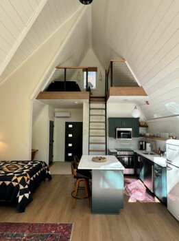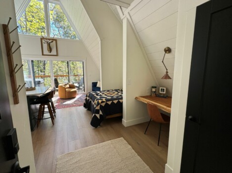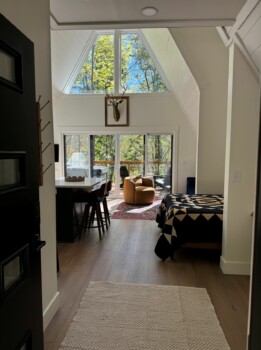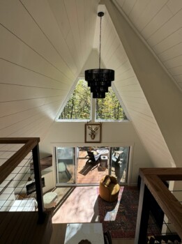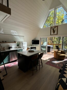 Upon arrival, you'll be greeted by the rustic elegance of the A-frame architecture, blending seamlessly with the natural surroundings. Inside, the open-concept space features tasteful décor and modern amenities, creating a warm and inviting atmosphere.