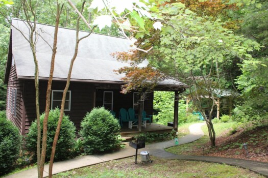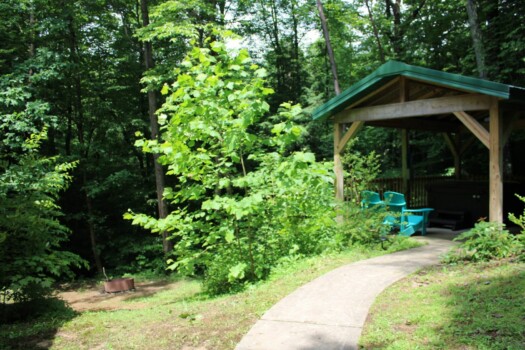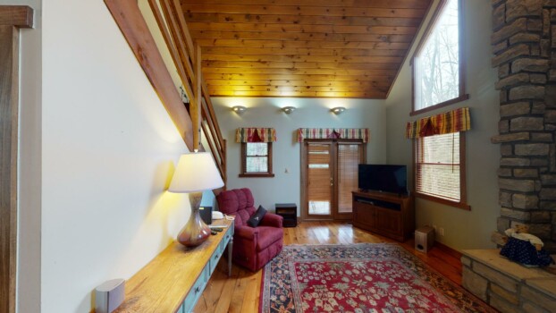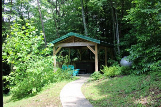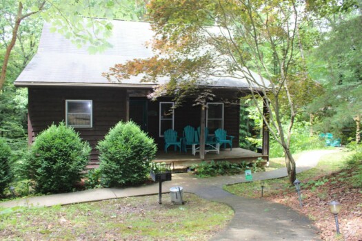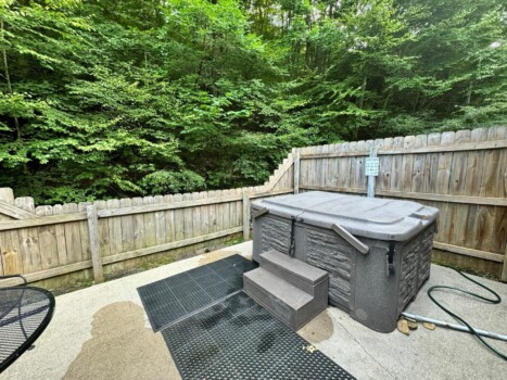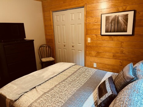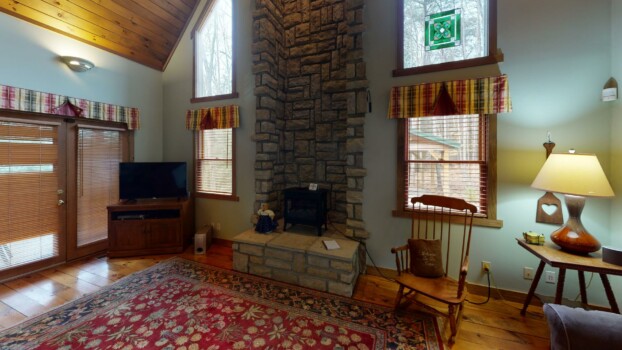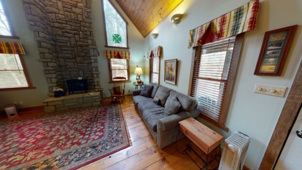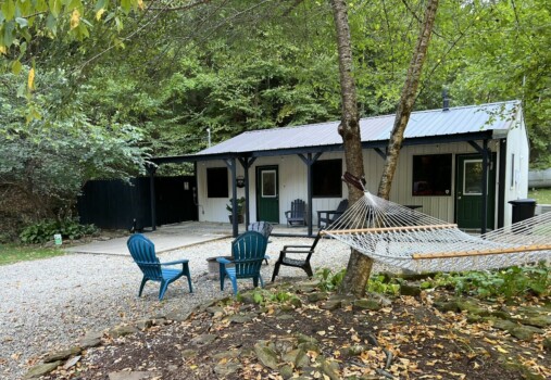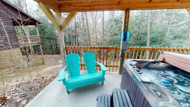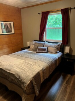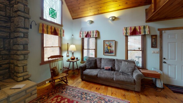 Sleeps 4 with a king loft bed and queen pull-out sofa. Enjoy a full kitchen, walk-in shower, and a private hot tub on the porch with tranquil forest views.