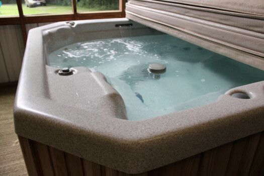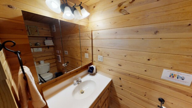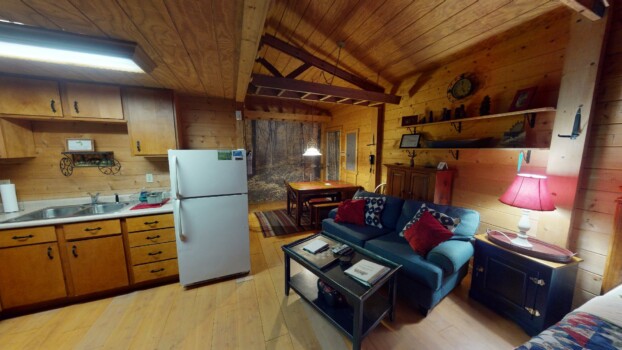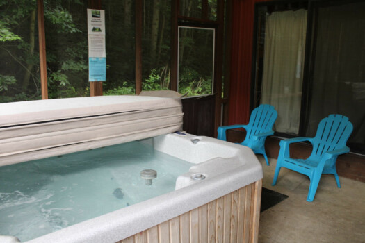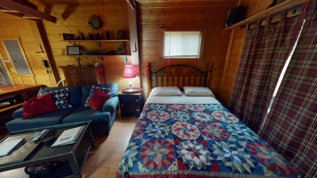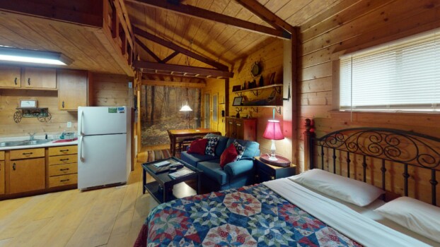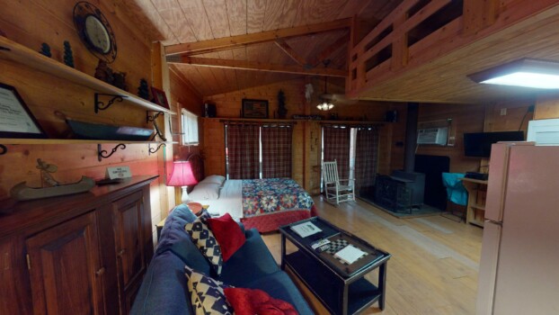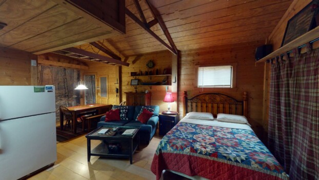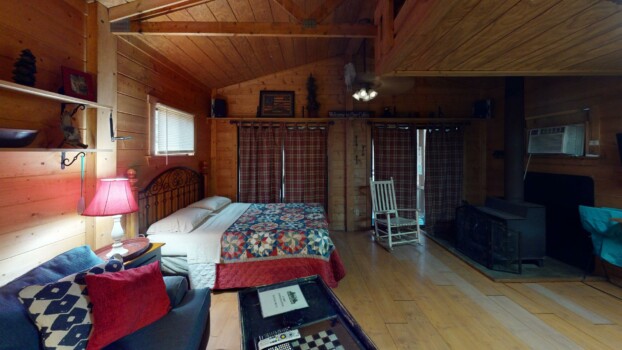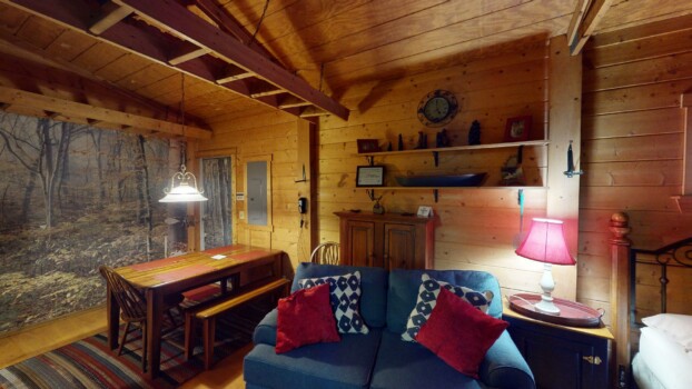 Sleeps 4 with a king loft bed and queen pull-out sofa. Enjoy a full kitchen, walk-in shower, and a private hot tub on the porch with tranquil forest views.